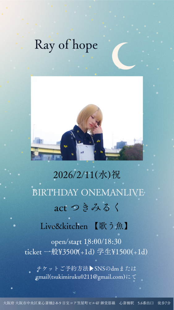 2026/2/11(水)祝 心斎橋歌う魚 ワンマンライブ SCHEDULE 2026/02/11(水) Live&kitchen 歌う魚 地図を表示 open/start 18:00/18:30 ticket¥3500 学生¥1500 (各+1d) つきみるくバースデイワンマンライブ開催! ご予約dmまたはgmailにてお待ちしております! URLをコピーする 報告する